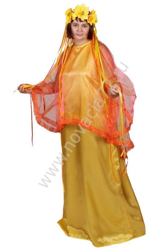 Костюм состоит из длинного платья золотистого цвета и венка из искусственных цветов и лент.