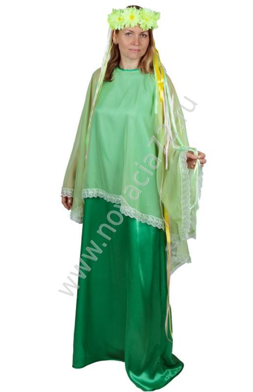 Костюм состоит из зеленого платья в пол и венка с искусственными цветами и длинными атласными лентами.