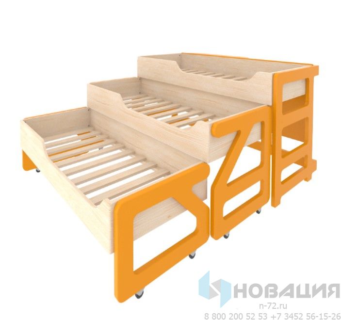 Кровать для дошкольников используется в спальной комнате детского сада. Оснащена 3 выдвижными ярусами (2 из них — на колесных опорах). Фигурные, чуть приподнятые, бортики защищают ребенка от падений.