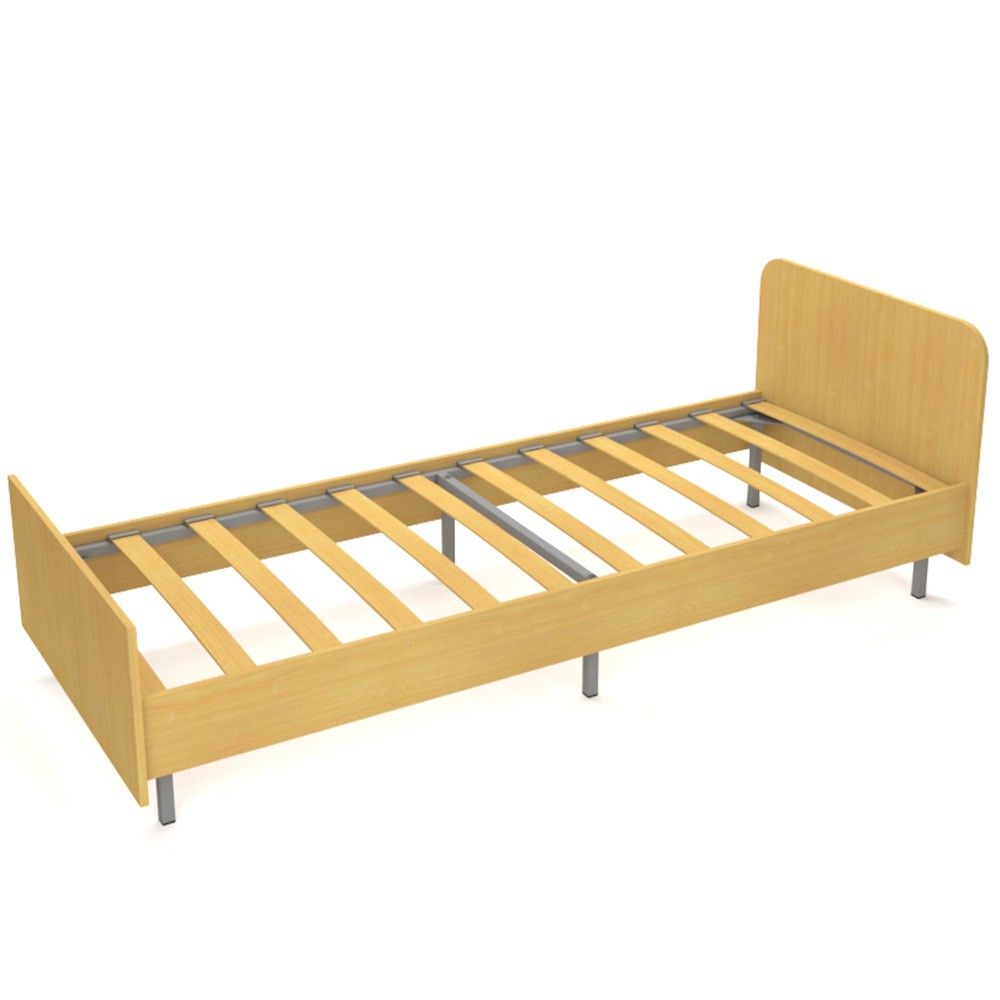 Кровать с ортопедическим основанием подходит для зон отдыха муниципальных учреждений. Ламели настилаются на каркас из труб сечением 25х25 мм. 1-местная мебель без бортов оснащена 2-мя вертикальными панелями с кромкой ПВХ. Панель у изголовья имеет закругленный верхний край.