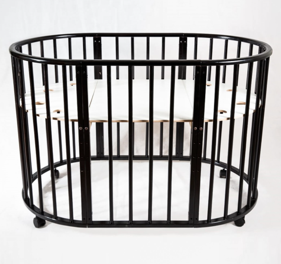Детская кроватка на колесах оснащена механизмом качания. Корпус после сборки приобретает форму круга (d 750 мм, h 860 мм) или овала (d 1250 мм, h 860 мм, ширина 750 мм). Спальное место окружено прутьями.