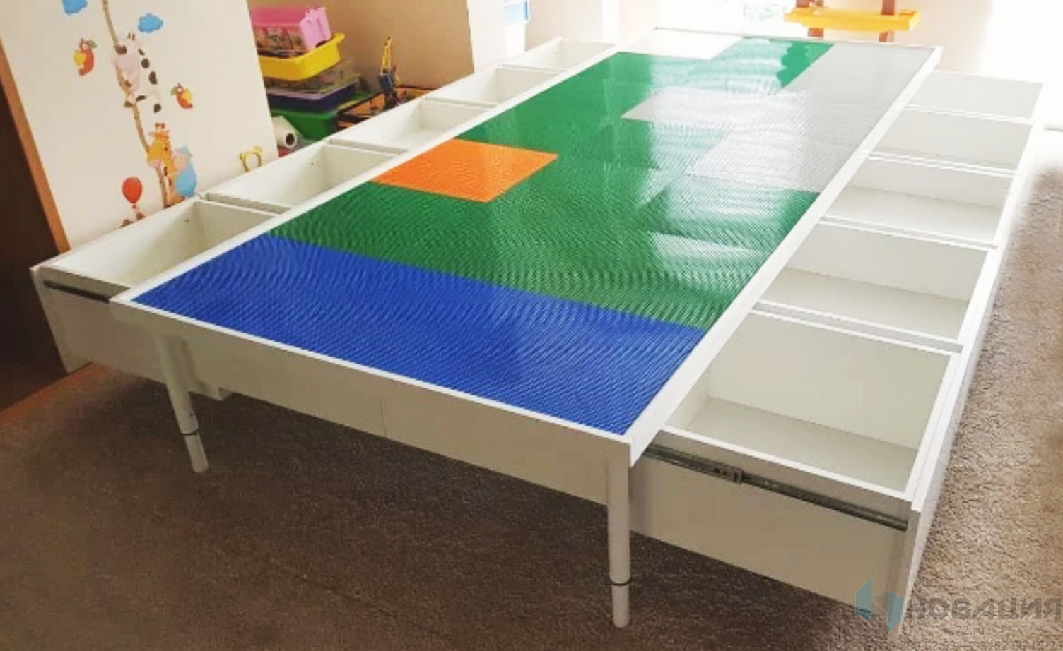 Мебель с LEGO-пластинами стоит на 4-х телескопических ножках. Развивающий стол подходит для наборов серии Duplo, City, Friends, Creators, а также других конструкторов. Детали хранятся в 10-ти выдвижных ящиках под разноцветными полотнами с рельефной поверхностью.