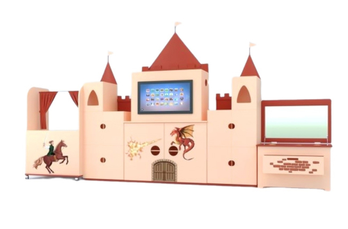 Комплекс выполнен в виде замка состоит из нескольких игровых зон. В центральной части располагается интерактивная панель со специализированным программным обеспечением. По бокам размещаются открытые книжные полки, под экраном - система хранения с дверцами.