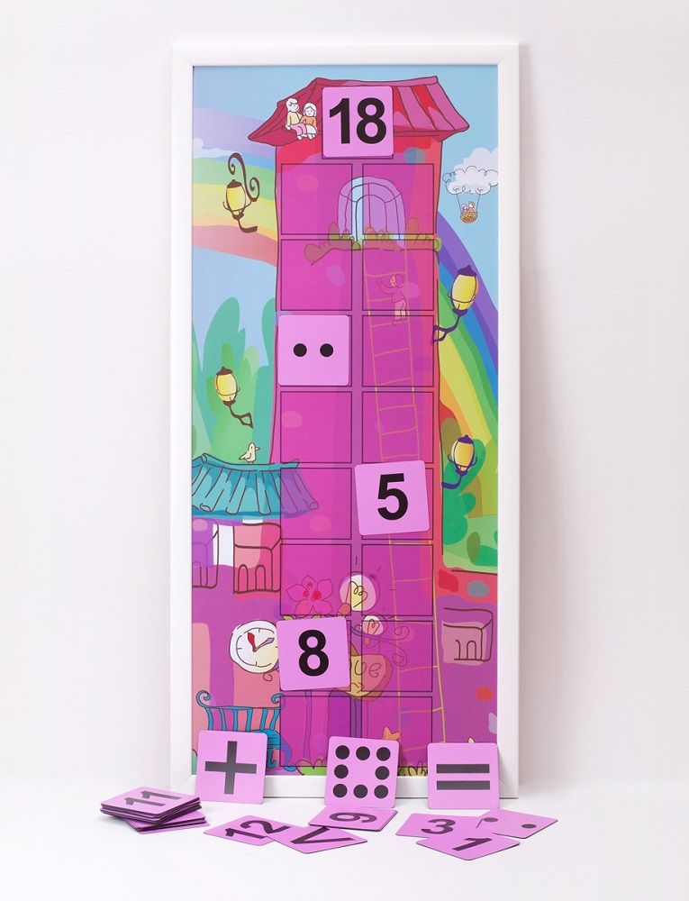 Оформлена в виде домика с окошками, в которых можно размещать карточки. Занятия с использованием доски помогут в игровой освоить арифметические действия, изучить первый и второй десяток чисел.