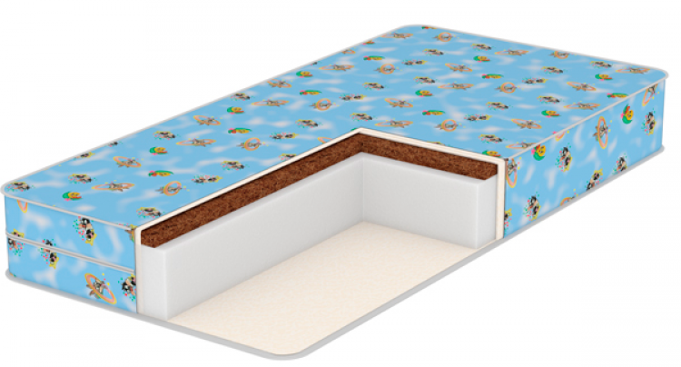 Двухслойный наполнитель с одной стороны выполнен из плиты, состоящей из натуральных кокосовых волокон, с другой стороны из экологичного нетканого материала — холлофайбера. Плита из кокосовых волокон равномерно распределяет нагрузку во время сна ребенка и способствует правильному развитию мышечного корсета. Обладает высокой вентилируемостью, не имеет запаха. Слой холлофайбера выполняет работу пружин, восстанавливает форму после сжатия, формируя ровную поверхность для сна.
