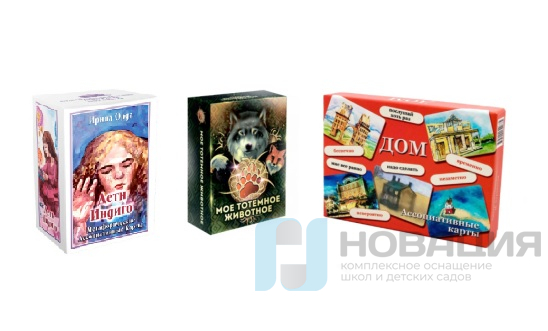 - Ассоциативные карты «Дом» - 72 карты-изображения, 75 карточек, передающих различные партнерские, семейные и родительские установки, 75 карточек, характеризующих психологическую атмосферу человеческих взаимоотношений, вкладыш с описанием базовых техник работы с набором.