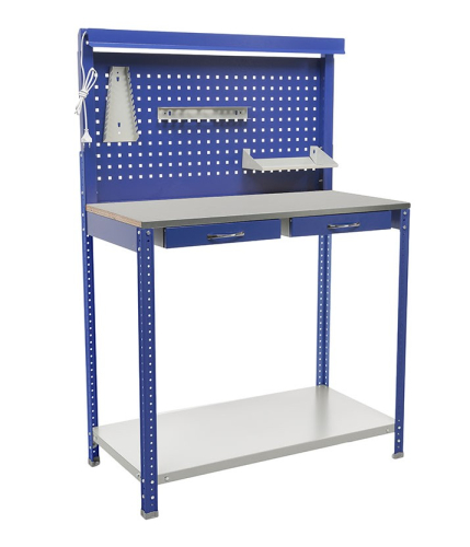 Верстак состоит из защитного экрана с отверстиями на которые можно крепить лотки, инструменты, крючки и прочие аксессуары. Выдерживает нагрузку до 300 кг. Имеет два выдвижных ящика с нагрузкой до 5 кг на ящик.