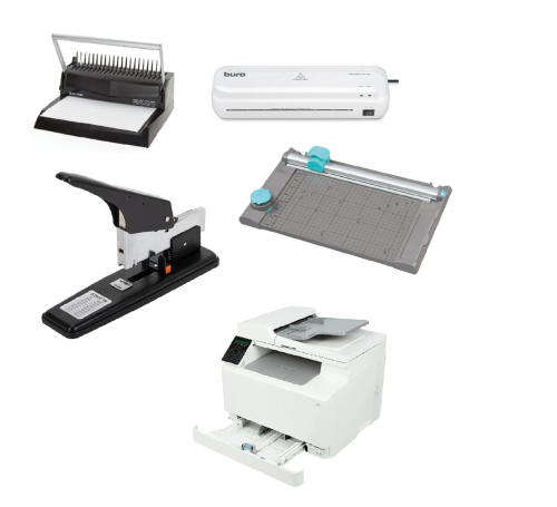 - Премиум (пакетный ламинатор, степлер мощный, брошюровщик, резак для бумаги, МФУ лазерное, обрезчик углов, термопереплетчик, обложки для термопереплета, пленки-заготовки для ламинирования).