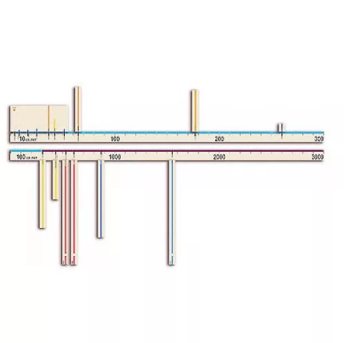 Длина каждой шкалы составляет 1.5 мм, деления через 5 см. Масштабы расстояний на линейных шкалах (3 шт.): в одном делении по 10/ 100/ 10000 световых лет. Логарифмические шкалы (2 шт.) отображают числовые значения в световых годах/ в километрах.