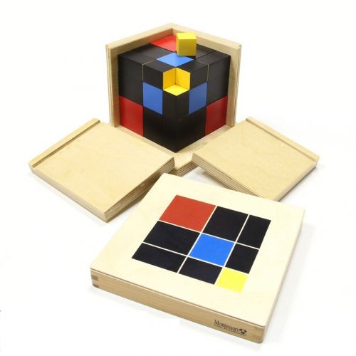 Из элементов набора можно собрать куб (триномиальный или биномиальный). Для этого грани одного цвета прикладываются друг к другу. Чтобы получить исходную фигуру, потребуется сравнить размеры деталей. Занятие соответствует методике Монтессори. Наглядно демонстрируются принципы алгебраических формул.