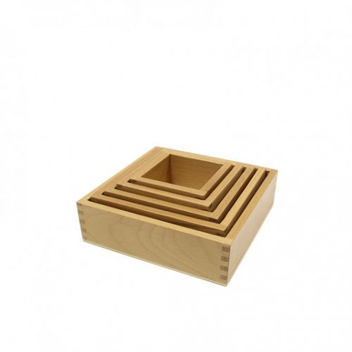 В комплекте для занятий по методу Монтессори 5 коробочек разной величины. Ящики вкладываются друг в друга по принципу матрешки. Ребенок учится сравнивать величину, тренирует глазомер, формирует причинно-следственные связи.