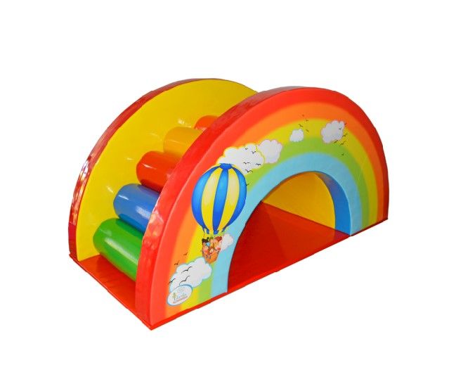Мостик для перелезания не имеет острых углов. Дугообразная конструкция оснащается упругими ступеньками цилиндрической формы, на боковых панелях изображена радуга. Спортинвентарь для дошкольников помогает преодолеть страх высоты, развить ловкость.