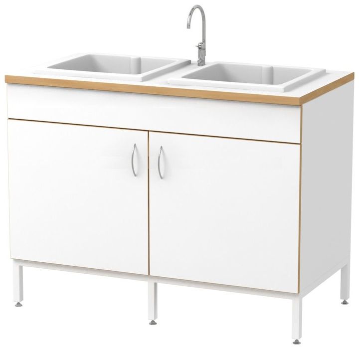 Стол для кабинета биологии оснащен 1 или 2-мя раковинами (400х400х300 мм) из полипропилена. Материал смягчает удары при падении хрупкой посуды. В мойке очищаются стеклянные, керамические, другие инструменты или емкости. Смеситель с арматурой позволяет подключать холодную и горячую воду.