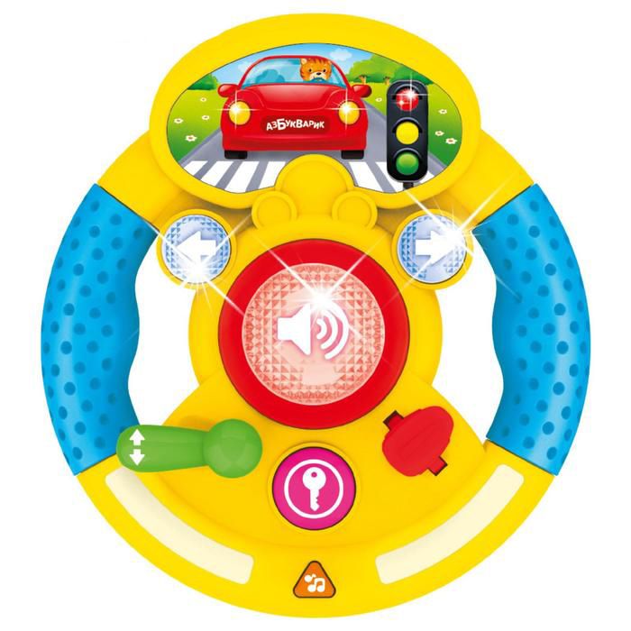 Разноцветная игрушка в виде автомобильного руля научит ребенка координировать свои движения, запоминать последовательность действий. Предлагается имитировать вождение: завести мотор, прибавить газ, посигналить, включить поворот. Руль дополнен звуковыми эффектами.