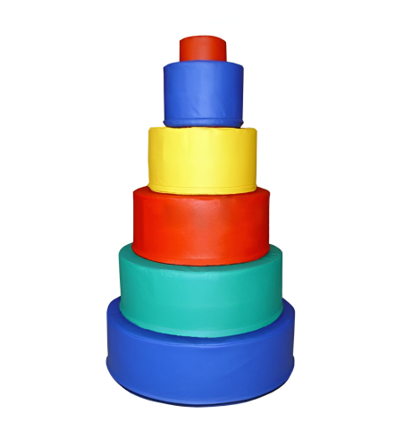 Составление пирамидки помогает дошкольникам развить логическое мышление, координацию, научиться сопоставлению размеров, цветоразличению. На отдельных кружках можно отдохнуть во время подвижных игр, используя модуль в качестве банкетки.