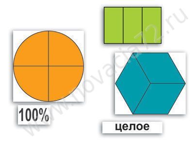 - карточки "целое", "половина", "треть", "четверть", "1", "1/2", "1/3", "1/4", "1/5", "1/6", "100%", "50%", "25%", "20%" – по 1 шт.,