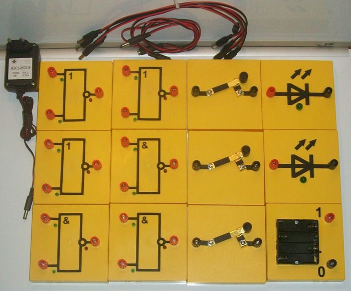 В состав набора входят: съемные панели с магнитным креплением, логическими элементами, светодиодными индикаторами, адаптером питания и другим оборудованием. Для работы необходимы классная металлическая доска, комплект проводов.