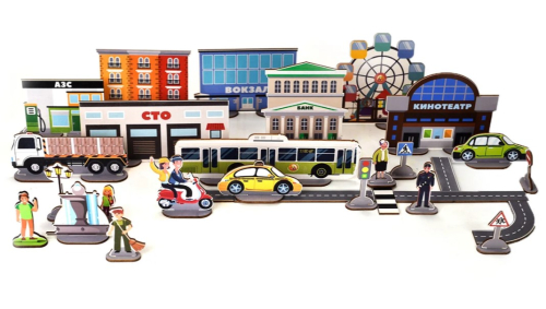 Цветной деревянный конструктор знакомит с инфраструктурой города, помогает расширить кругозор. В конструкторе представлены фигурки для строительства миниатюрных парков, больниц, улиц. Воображаемый город наполнится изображениями людей, машин, дорожных знаков, фонтанов, скамеек, зданий, деревьев.