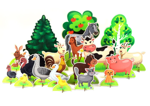 Цветной деревянный конструктор представлен фигурками животных и птиц (козы, гуси, свиньи, ослик, собака, индюк и др.), атрибутами фермы (садовые и хвойные деревья). Сюжетно-ролевая игра погружает ребенка в деревенские будни, помогает расширить кругозор и укрепить кисти рук.