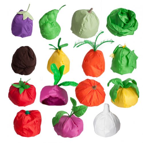 Набор состоит из 15 шапочек с резинкой, выполненных в виде овощей: