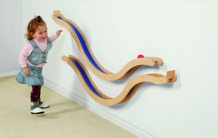 Настенный лабиринт состоит из двух изогнутых дорожек и деревянного шарика, который нужно катать по ним. В желобке дорожек размещается пластмассовый протектор.