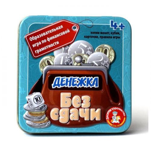 В комплекте: монетки в натуральную величину, карточки товаров с ценами, правила, кубик с изображениями номиналов монет.