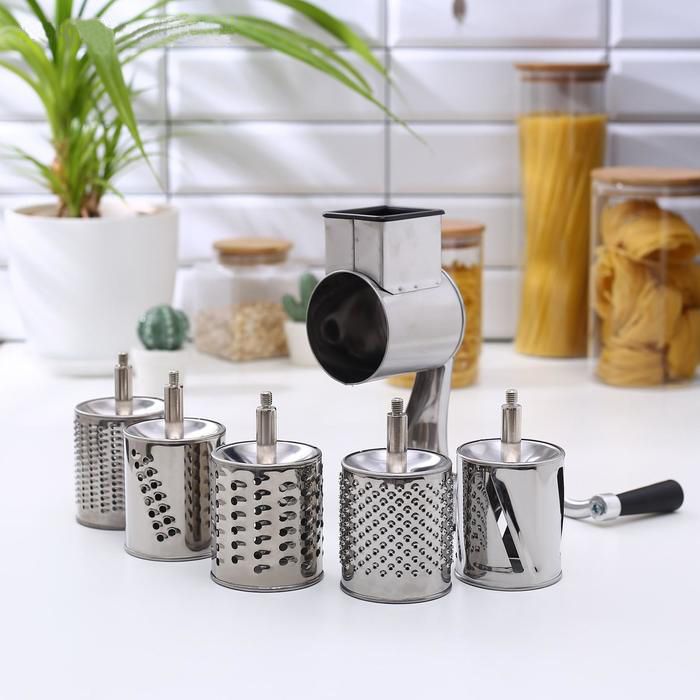 Ручной комбайн с 5-ю барабанами и вместительным дозатором используется на кухне. Для измельчения продуктов необходимо крутить ручку. Корпус изготовлен из нержавеющей стали. Крепеж вакуумный.