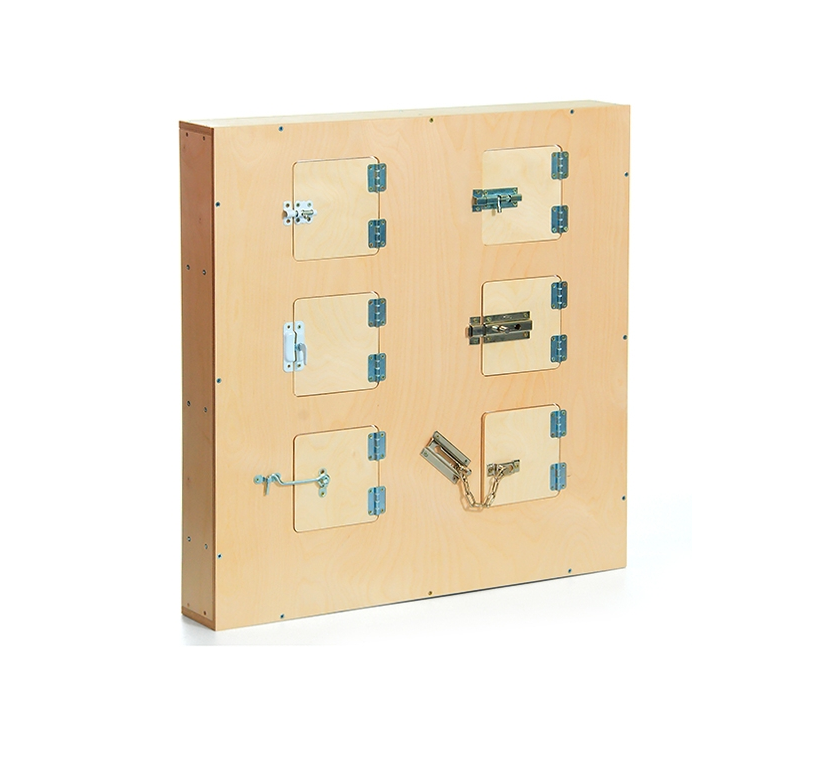 Вертикальная панель с дверцами на замках помогает развить познавательный интерес у ребенка. Щеколды, крючки и цепочки нужны для тренировки пальцев. За створкой можно спрятать поощрительный приз.