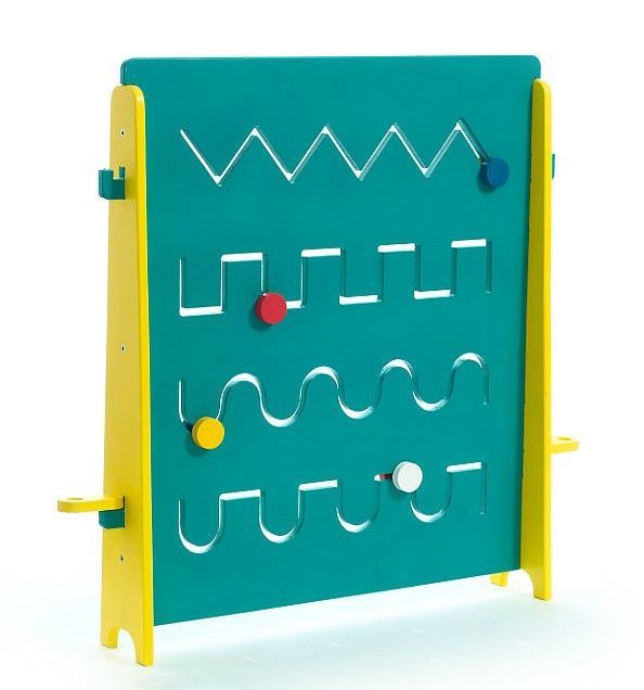 Панель на боковых опорах представляет собой поле с тактильными лабиринтами. Дошкольник перемещает элементы в прорезях. Траектория продумана таким образом, чтобы подготовить кисть ребенка к письму. Подходит для ОВЗ.