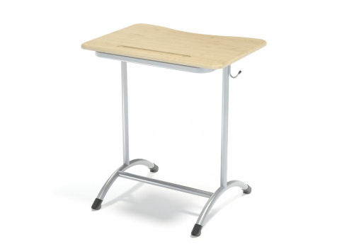 Одноместная парта подстраивается по высоте под несколько ростовых групп. Каркас разборный. Стационарные опоры в форме дуги усилены перекладиной. На столешнице с изгибом для правильной посадки есть врезной пенал. С 2-х сторон мебели закреплено по одному крючку.