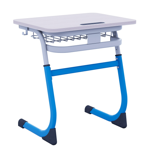 Парта регулируется по высоте. Сборно-разборный каркас парты изготовлен из стальных плоскоовальных труб и состоит из пояса, двух стоек, перемычки и двух опор. Стойки крепятся к поясу при помощи винтов. Опоры вставляются в нижнюю стойку и стягиваются между собой. Столешница крепится при помощи металлических уголков, под ней размещается корзина для книг и канцелярии (размеры ШхГхВ - 475х310х100мм).