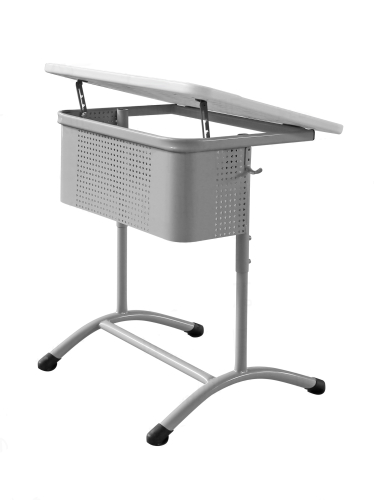 Столешница выполнена из пластика и крепится к металлическому каркасу винтами. Она не имеет кромки и пленки, а также оборудована углублениями для кружки и ручки. Уровень наклона столещницы регулируется до 15 градусов.