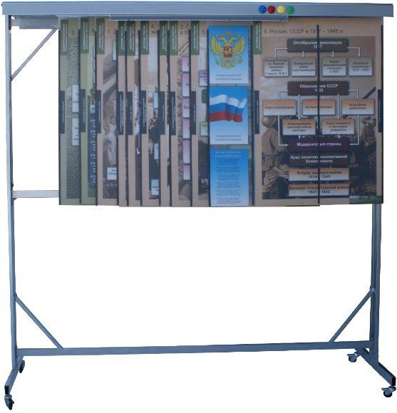 Плакатница на металлическом каркасе с колесами размещается в кабинете школы. Конструкция подходит для размещения в книжной ориентации карт, чертежей, рисунков, чистых ватманов, схематических и табличных материалов. Стойка для наглядных пособий оснащается магнитными файлами с профилем из ПВХ.
