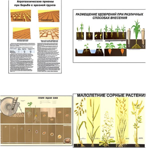 Плакаты используются для изучения о методах борьбы с эрозией почвы, рациональном применении удобрений, особенностях севооборотов и правилах посадки растений.