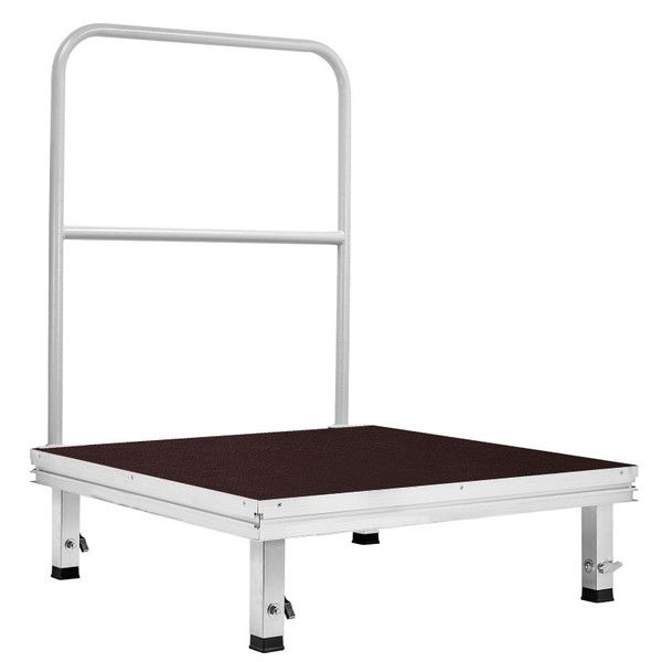 Высота помоста на 4-х ножках фиксируемая. Телескопические подпятники помогают выравнивать площадку. Подиум устойчив и долговечен. Поверхность 1-ступенчатой конструкции выдерживает нагрузки до 750 кг/м2. Это неприхотливое оборудование, которое защищено от воздействия влаги.