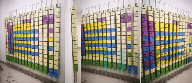 Интерьерное решение для школы, университета или ДОУ соединяет в себе информационную доску и образовательный инструмент. Конструкция состоит из поворотных кубиков с рисунком, нанизанных на вертикальные металлические стойки. Кубы могут поворачиваться разными сторонами.