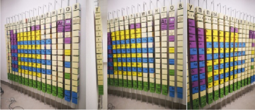 В кабинете химии квест-стена посвящается открытиям Д.И. Менделеева. На гранях кубов школьник видит названия химических элементов.