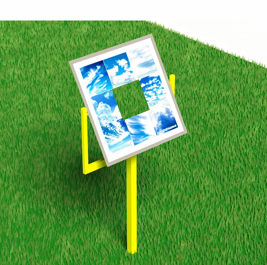 Стенд для метеоплощадки используется при наблюдениях за природой. На квадратной панели с окошком изображены виды облаков. Поверхность вращается на стойке.