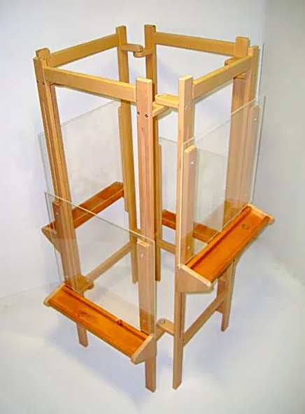 Прозрачный мольберт состоит из 4 частей. Каждое рабочее место оснащено полкой для кистей и красок. Готовую работу можно сохранить на бумаге. Для этого нужно приложить к свежему рисунку лист ватмана. Если рисунок успел немного подсохнуть, можно сначала слегка увлажнить его, а затем приложить бумагу.