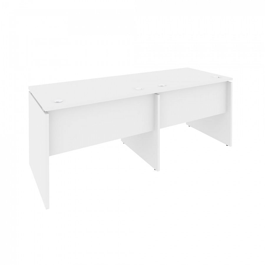 Рабочая станция с 2-мя столешницами и царгой опирается на 3 панели. П-образный металлический каркас позволяет офисной мебели прочно закрепиться на поверхности пола. Пластиковые элементы на опорах с винтами регулируются по высоте. Детали из ЛДСП отделаны кромками толщиной 0,4 мм и 2 мм.