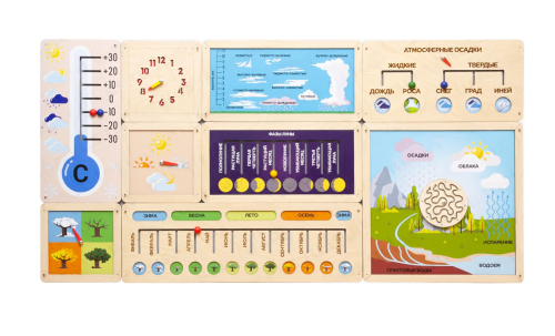 Настенная панель выполнена из гипоаллергенных материалов. Содержит тактильные развивающие элементы: лабиринты, бегунки и пр. Позволяет изучать погодные и природные явления.