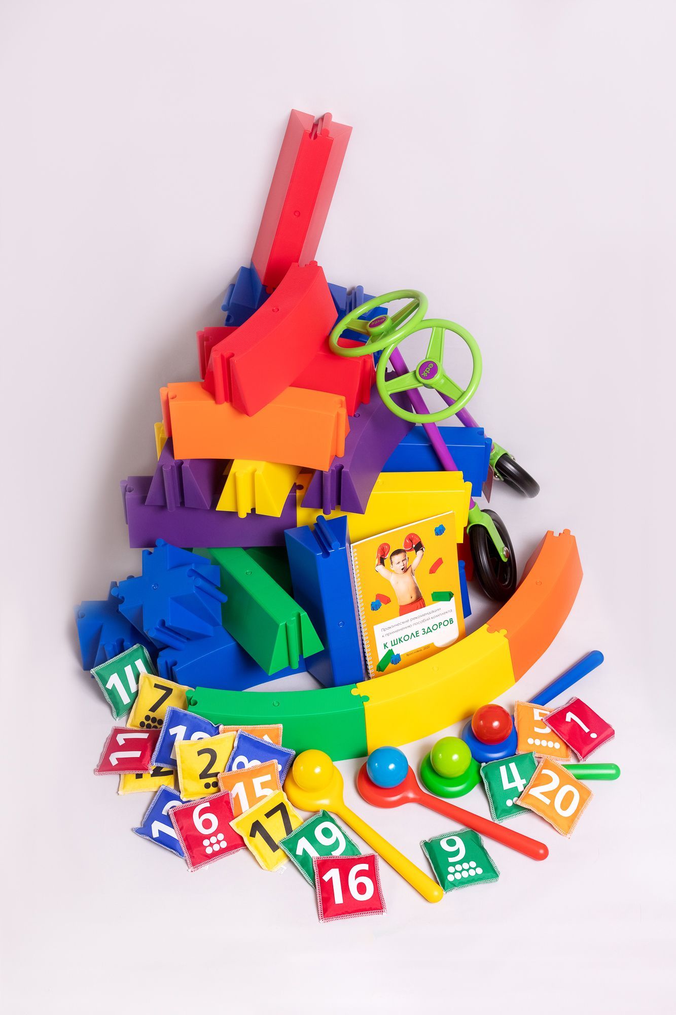 Элементы представлены в 5-ти цветах. На поверхности мешочков наносятся изображения цифр от 1 до 20. Занятия с набором обучают счету, стимулируют мышление и цветоразличение, развивают память.