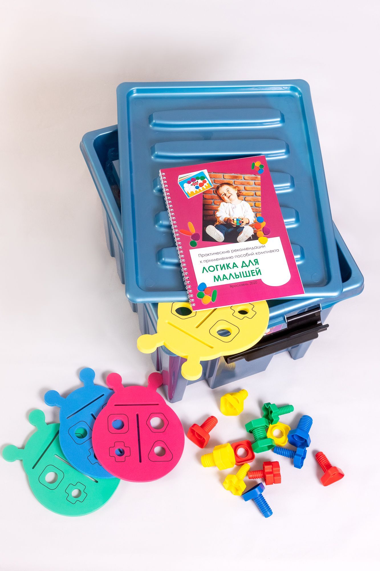 Блоки в форме жучков соединяются болтами и гайками (по 16 элементов в наборе, 4 цвета и 4 размера). Форма гайки и шляпки болта соответствует одной из 4-х геометрических фигур, поэтому во время занятий ребенок осваивает логику, тренируется находить соответствие и самостоятельно принимать решение.