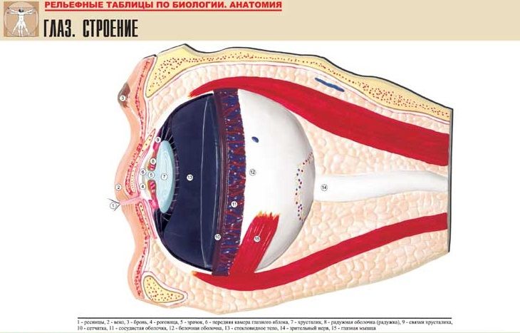 Таблица для уроков биологии (анатомии) покрыта матовой пленкой с объемным эффектом, исключающим блики. На белом фоне схематически изображено строение человеческого глаза. Элементы выделены разными цветами, сопровождаются разъясняющей информацией. Благодаря специальной полноцветной печати рисунок выглядит рельефным.