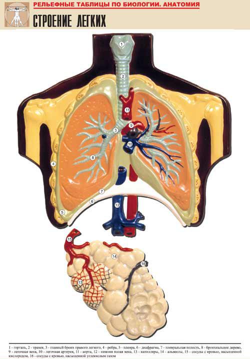 На белом фоне изображено строение легких человека. Элементы рисунка обозначаются разными цветами, сопровождаются поясняющей информацией. Таблица для уроков биологии (анатомии) покрыта матовой пленкой с объемным эффектом, исключающим блики. Рисунок с полноцветной печатью выглядит рельефным.