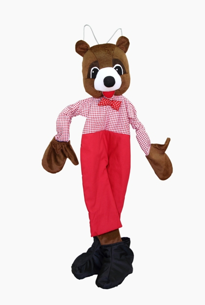 Карнавальный костюм фиксируется на шее при помощи тесемки; ноги вставляются в валенки; на руки надеваются варежки на резинках.