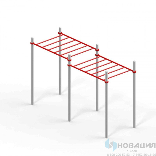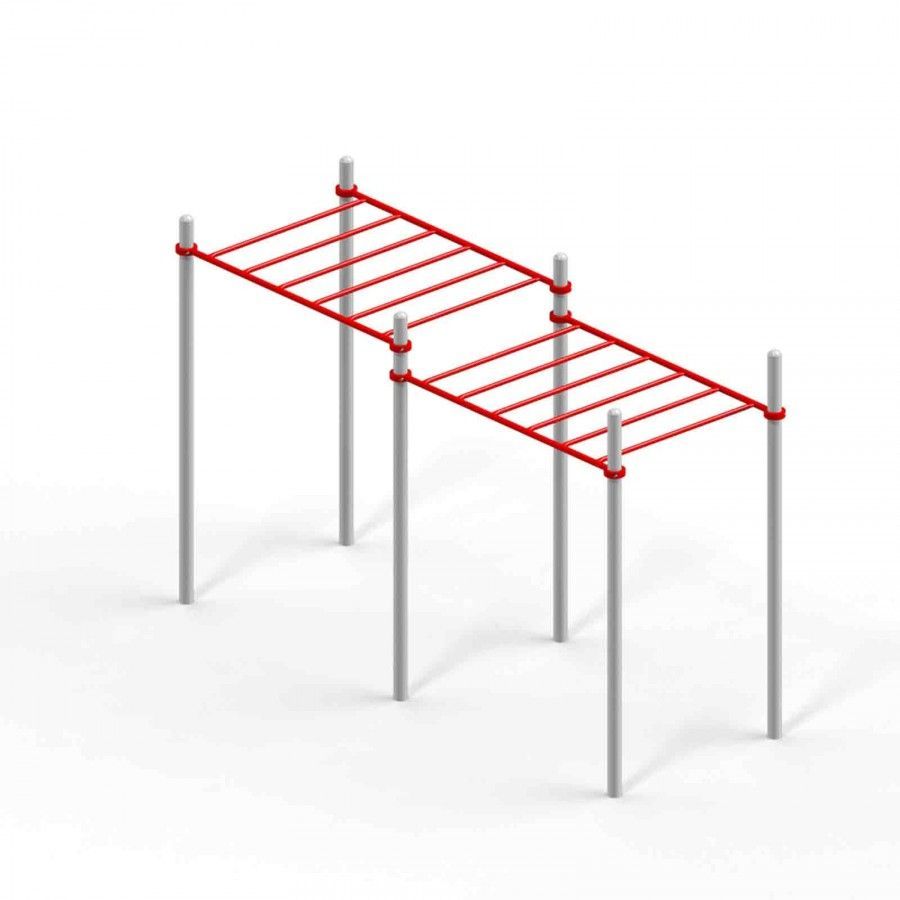 Конструкция состоит из 2-х рукоходов, закрепленных на разной высоте. В каждом есть перекладины, d 33 мм, и 2 направляющих трубы, d 42 мм. Оборудование опирается на 6 несущих стоек, d 88 мм. Подходит для виса, подтягивания, гимнастических упражнений.