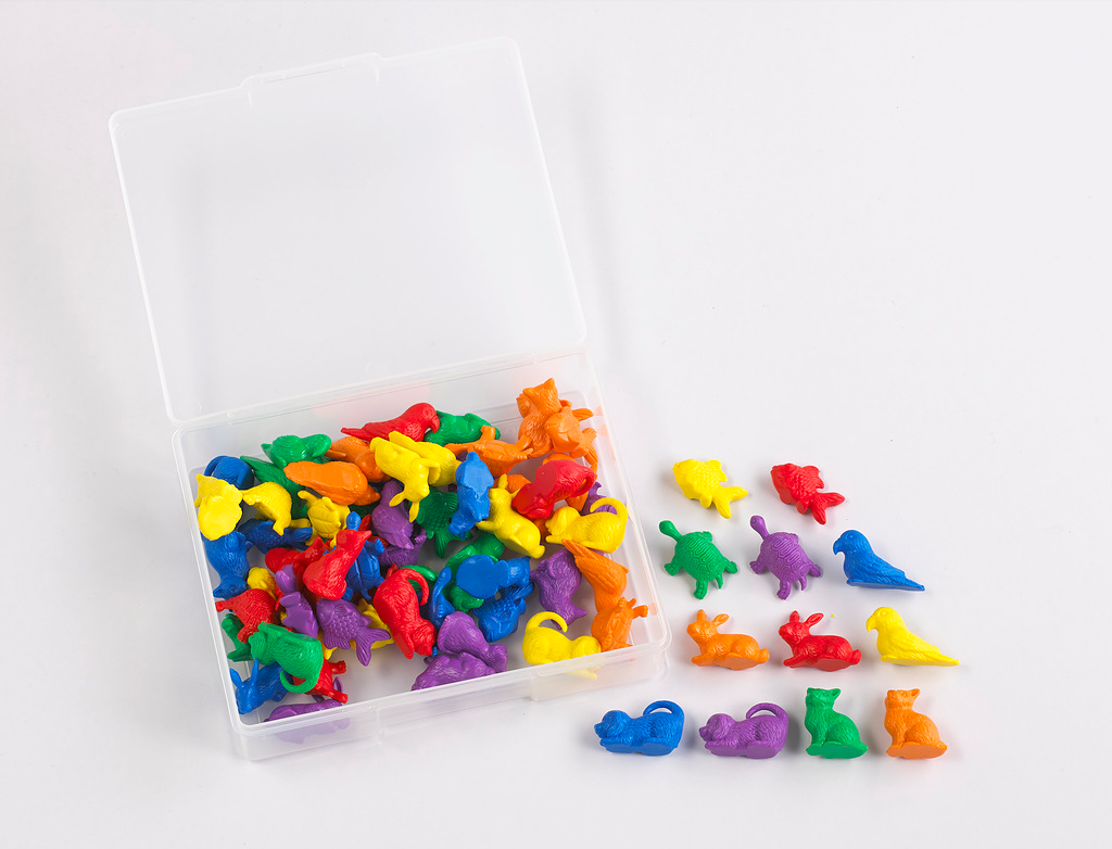Счетный набор включает в себя 72 разноцветные фигурки наиболее распространенных домашних животных: попугай, кошка, собака, кролик, рыбка, черепаха (длина каждой фигурки около 3,5 см).