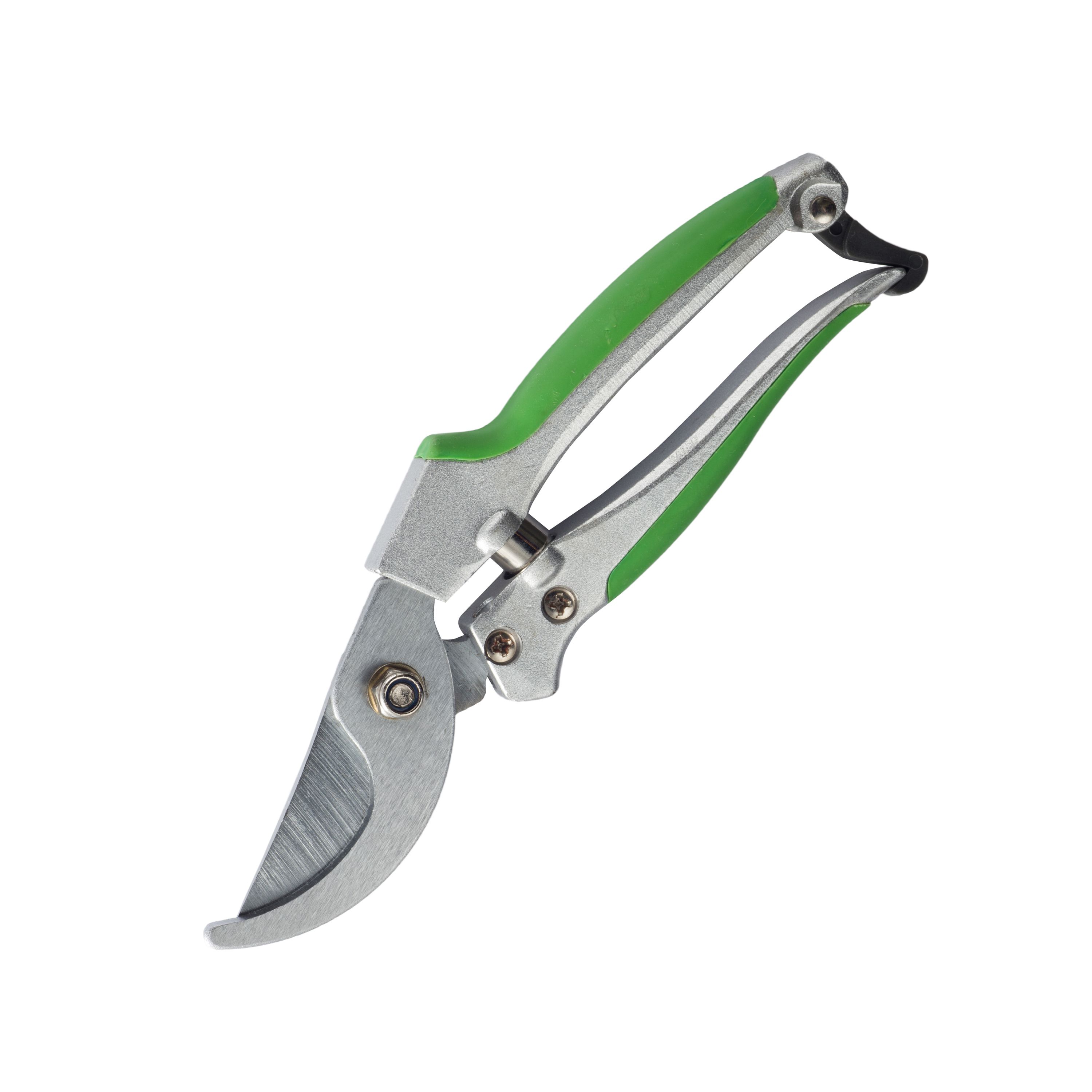 Эргономичный секатор с изогнутым лезвием применяется для обрезки ветвей в саду. Полотно из закаленной стали делает пропил до 15 мм. Алюминиевая ручка с мягкими зелеными накладками не утомляет кисть и защищает от скольжения инструмента.