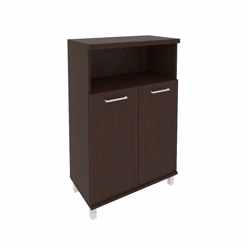 Стеллаж с низким фасадом за 2-мя глухими распашными дверцами оснащается горизонтальной нишей под топом. ЛДСП отделана кромкой (0,4 и 2 мм) в цвет мебели. Шкаф для документов стоит на высоких регулируемых опорах из металла. Обе створки широких дверц дополняются фурнитурой.
